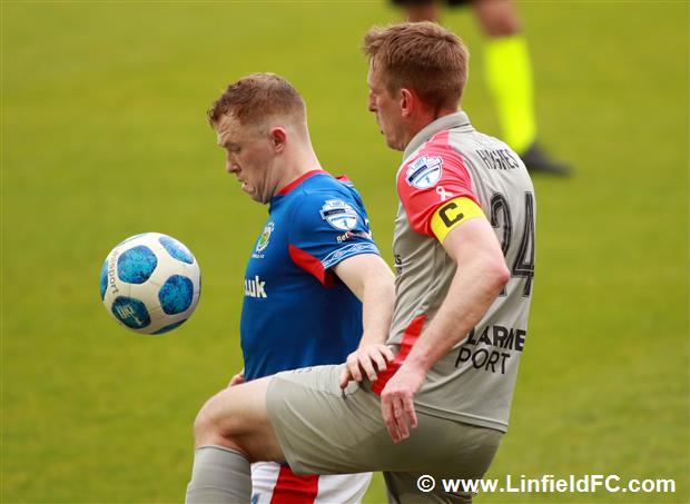 A Larne corner fell kindly for Josh Robinson at close range and he looked like he was certain to score, but Stephen Fallon did superbly to do enough and stop Robinson pulling the trigger. The former Linfield defender claimed for a penalty but it was a good challenge and his appeals were waved away.