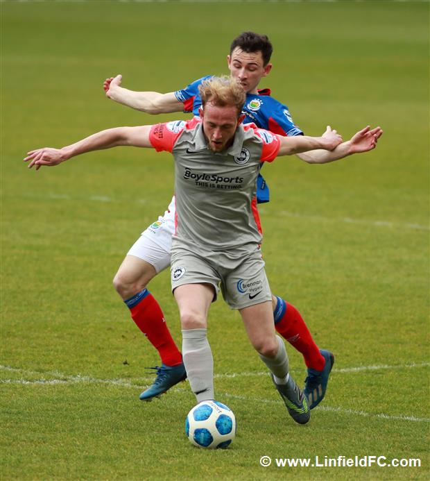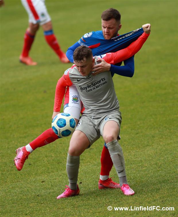 Linfield had another golden chance to score when Stephen Fallon nipped in after two Larne players collided and the midfielder put Shayne Lavery through on goal, but again the striker was denied by a big save by Conor Mitchell who made himself big to block with his chest.