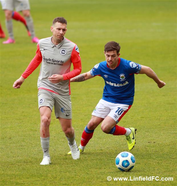 Finally, on 85 minutes, Linfield found their leveller. A corner from Kirk Millar was cleared only as far as Niall Quinn who was 25 yards out. The left back took a touch and rifled a half-volley into the bottom corner – a great strike and a deserved equaliser.