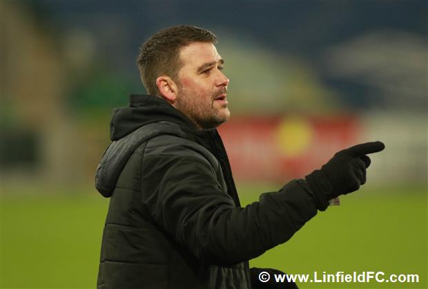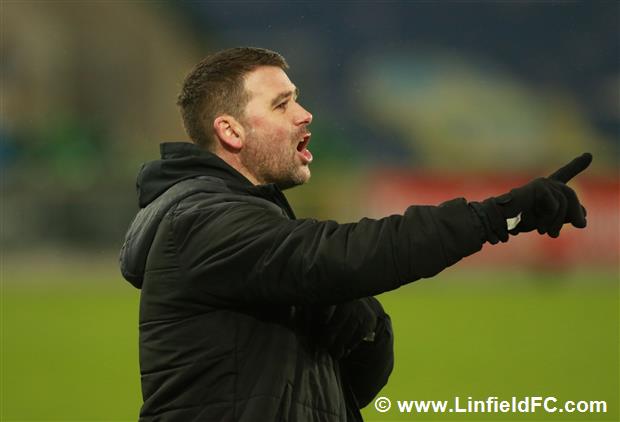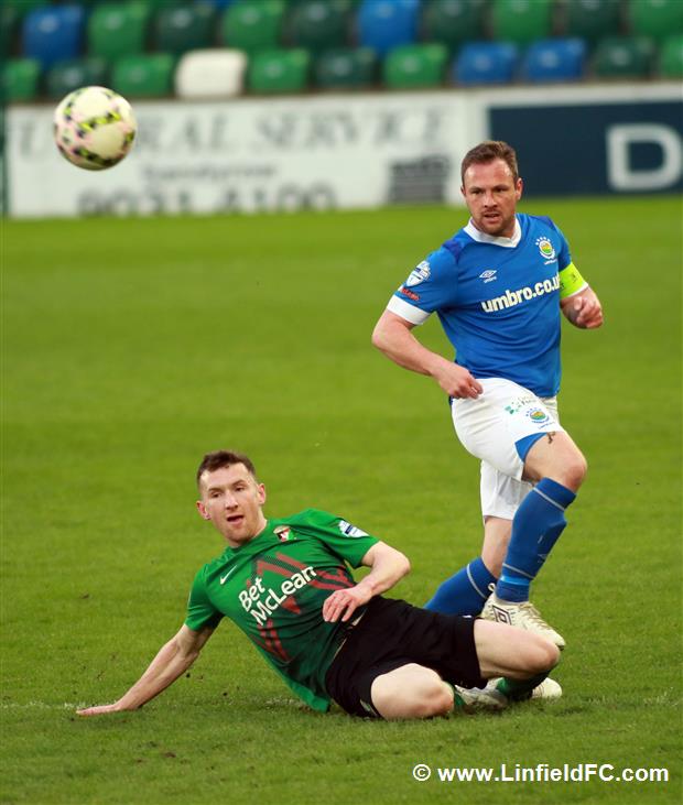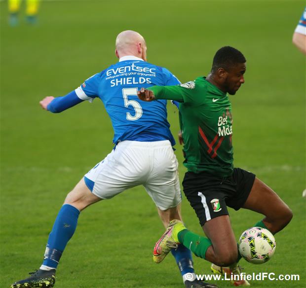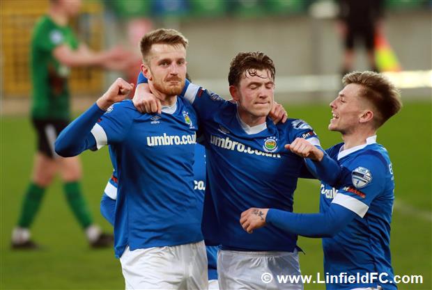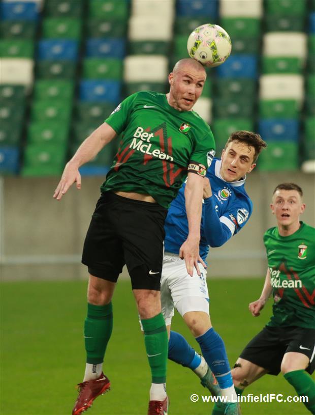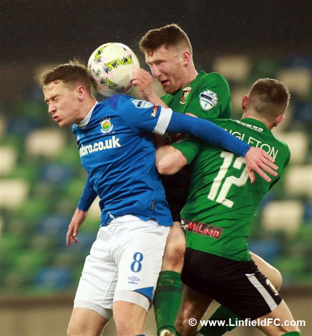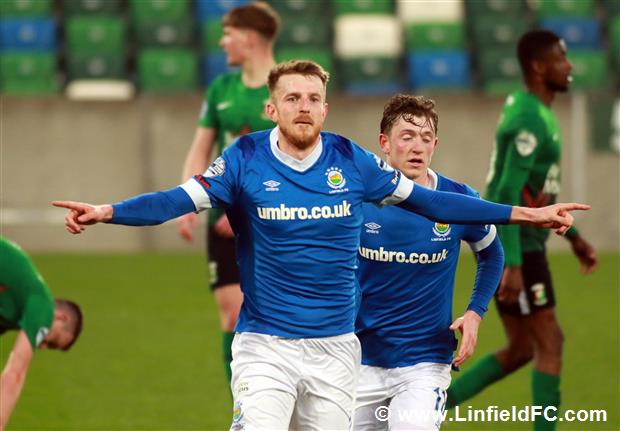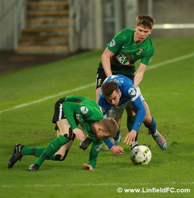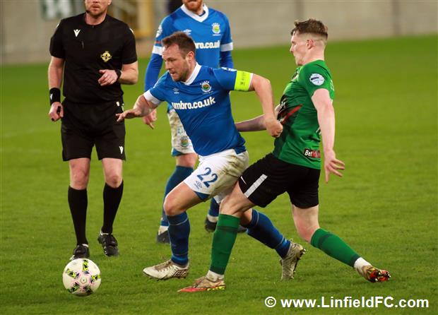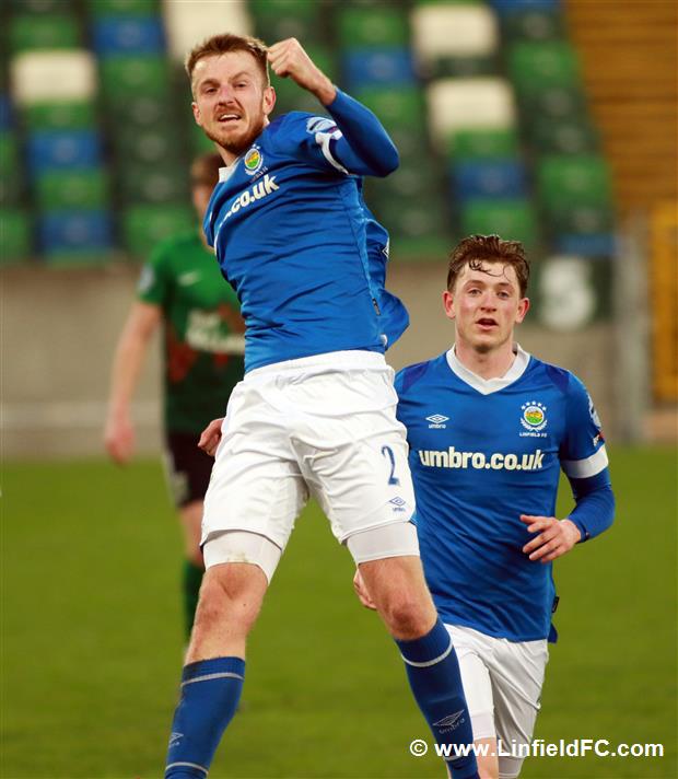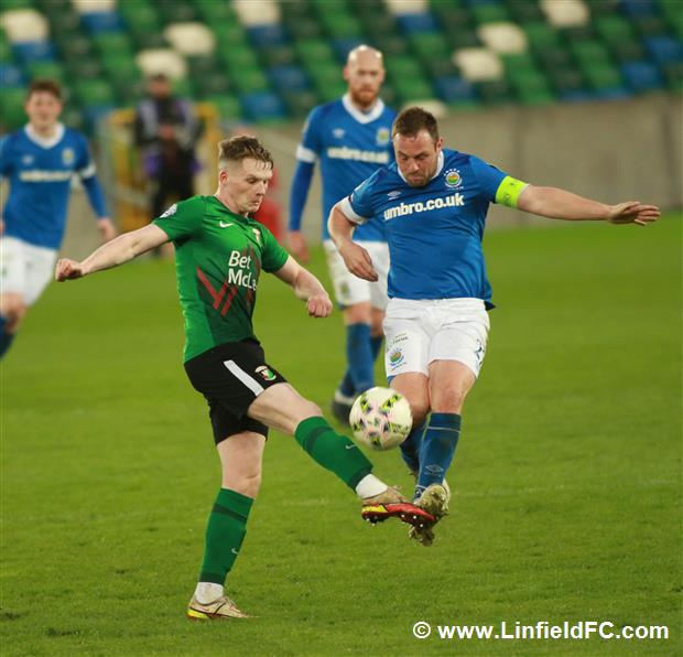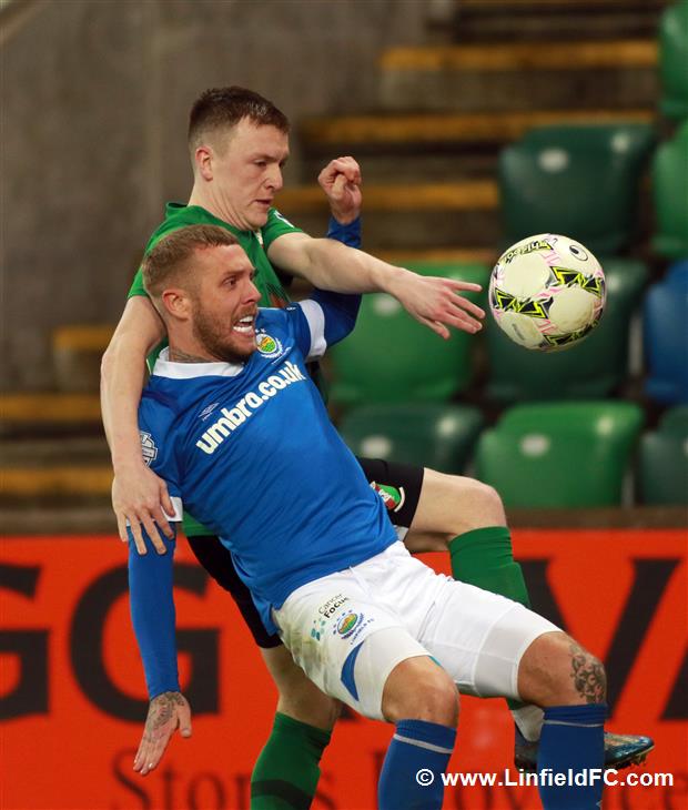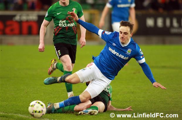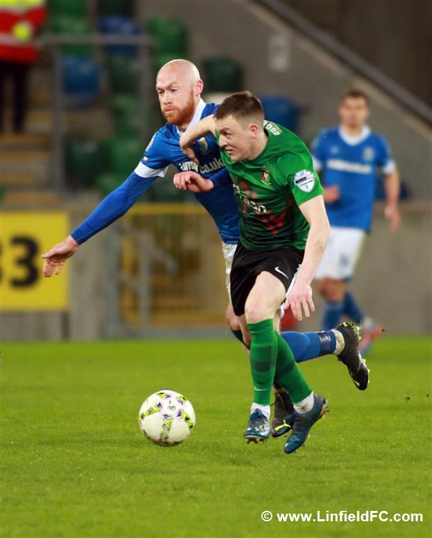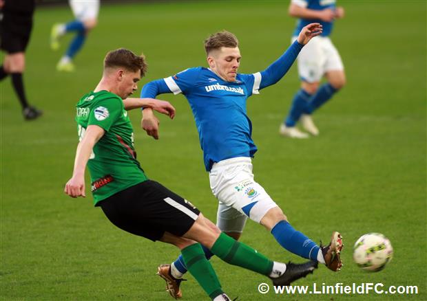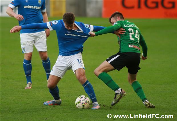The game went into a lull before a burst of life towards the end of the half, with Linfield going close twice in quick succession. Firstly, a neat move in midfield provided a platform for Stephen Fallon to burst through before his curling shot from the edge of the box was well saved.